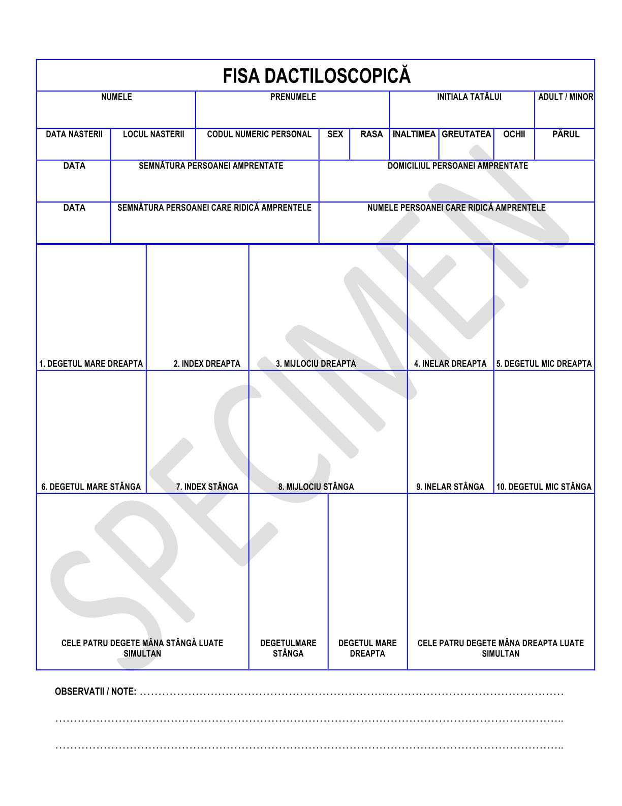 Fișa dactiloscopică este livrată imprimată pe hârtie-carton de calitate superioară, cu grosimea de 120 g/mp.